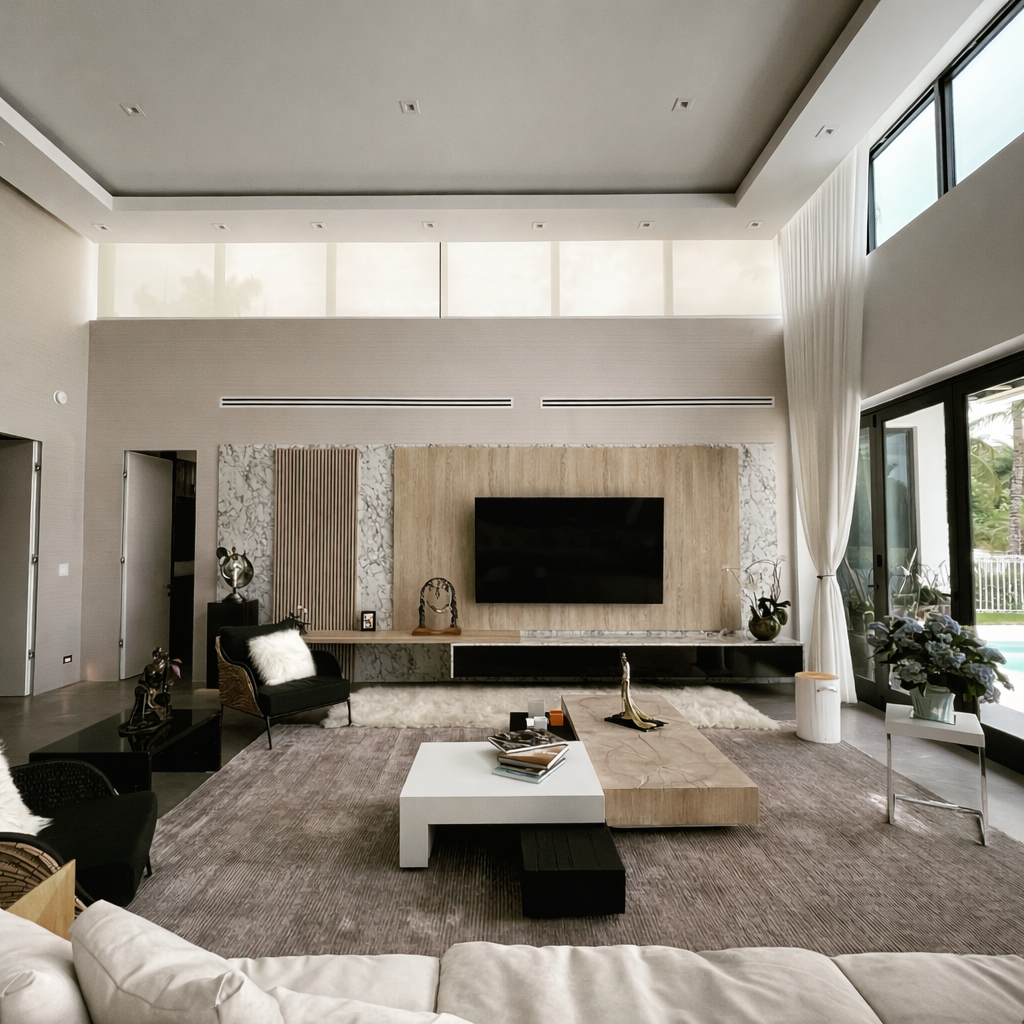 The interior of Doral Villa 2 is structured around open and fluid spaces that prioritize natural light, comfort, and functional clarity. Double-height areas and carefully planned transitions allow living, dining, and kitchen spaces to connect seamlessly, supporting a contemporary and flexible lifestyle. Refined finishes, a well-integrated kitchen, and thoughtfully designed private areas define an interior where architecture and interior design operate as a unified system, creating a calm, elegant, and timeless residential environment.